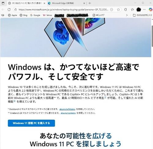 家のパソコンに時々、Windows11パソコンの営業画面が出てきます。 そして、Win11パソコンの購入ボタンを押すと、 Amazonと大手の家電屋さんのボタンが出てきます。 間違いなく、マイクロソフトに上納している企業ですね。 まだまだ元気に稼働しているパソコ…